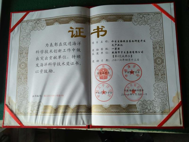 近日,國家海洋局、中國海洋學會等部門對在促進海洋科學技術創(chuàng)新工作中做出突出貢獻的單位進行表彰,威海市宇王集團“水生生物膠原蛋白研究開發(fā)及產業(yè)化”項目榮獲一等獎,也是全國僅有的三個獲獎企業(yè)之一。同時宇王集團研發(fā)的“魚鱗膠原蛋白肽粉”、“海參肽粉”、“海參飲品”、“魚鱗膠原蛋白”產品被中國水產流通與加工協(xié)會水產資源高值化利用工作委員會授予“創(chuàng)新優(yōu)秀產品”稱號。