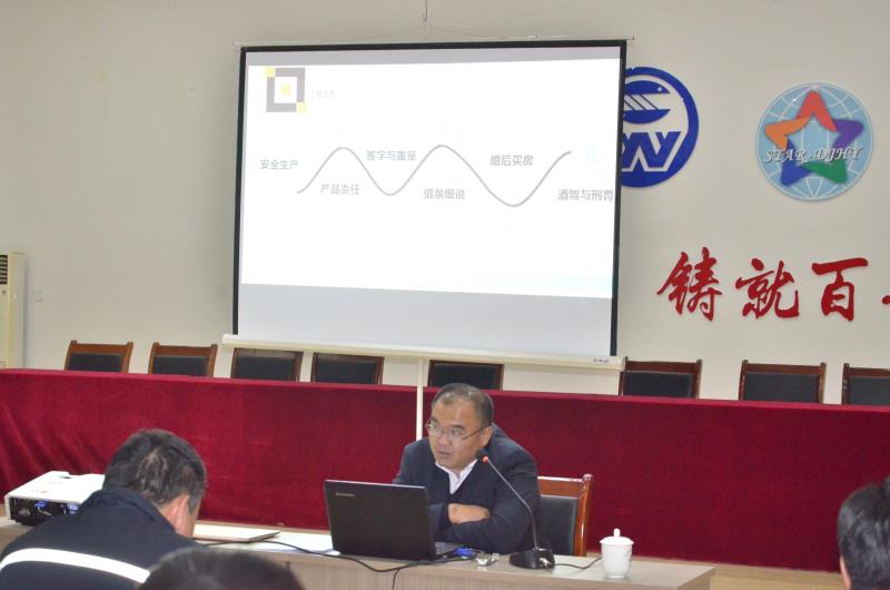 柳律師并沒有高屋建瓴詳談法律法條,而是結合企業發展實際情況,從參會人員的日常工作和生活出發,深入淺出的為大家解答疑惑。在“安全生產、產品責任、合同簽字蓋章、細說借條、不動產歸屬權、酒駕與刑罰”等六個分類事項上,通過身邊大量案例講解,概念闡述,現場互動等方式授課。整場內容豐富,寓意深刻,易于接受,令所有參訓人員感到意猶未盡,受益匪淺。