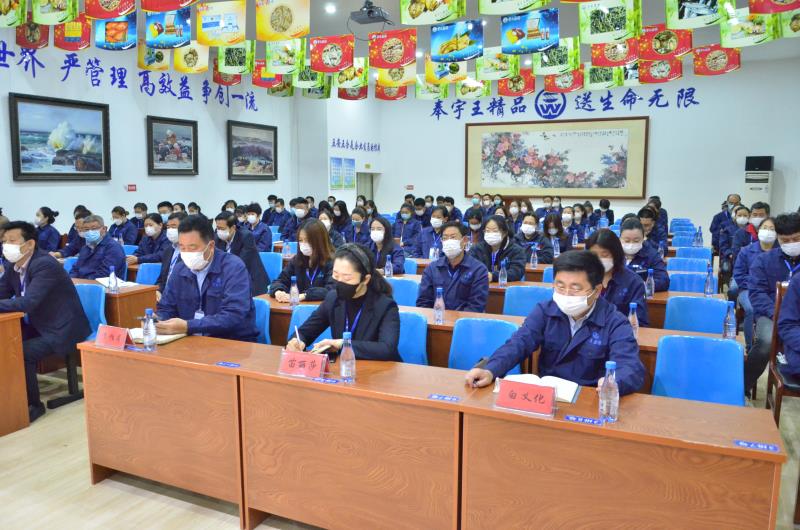 會上,苗強董事長作專題講話,他首先就1月----4月份公司防控疫情、復工復產等工作作簡要總結。到3月中旬,宇王集團的水產品加工車間、海洋生物加工車間、內貿及軍供加工車間已全部正常生產。集團對全體職工建立行程檔案,及時匯報、嚴謹記錄;采取嚴格防控措施,員工進入公司全程佩戴口罩,園區內車間、道路、班車、辦公樓全面消毒不留死角不漏盲區,一天不少于三次,全天定時定點測溫不少于兩次;食堂分時段分區域有序進餐,同方向,保距離,不逗留,不聊天,并加強對員工的培訓和教育,提高科學防控意識。